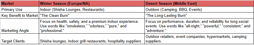 A strategic B2B guide for charcoal distributors. Learn how to market the same coconut charcoal product to capture both the "indoor winter" and "outdoor desert" peak seasons.